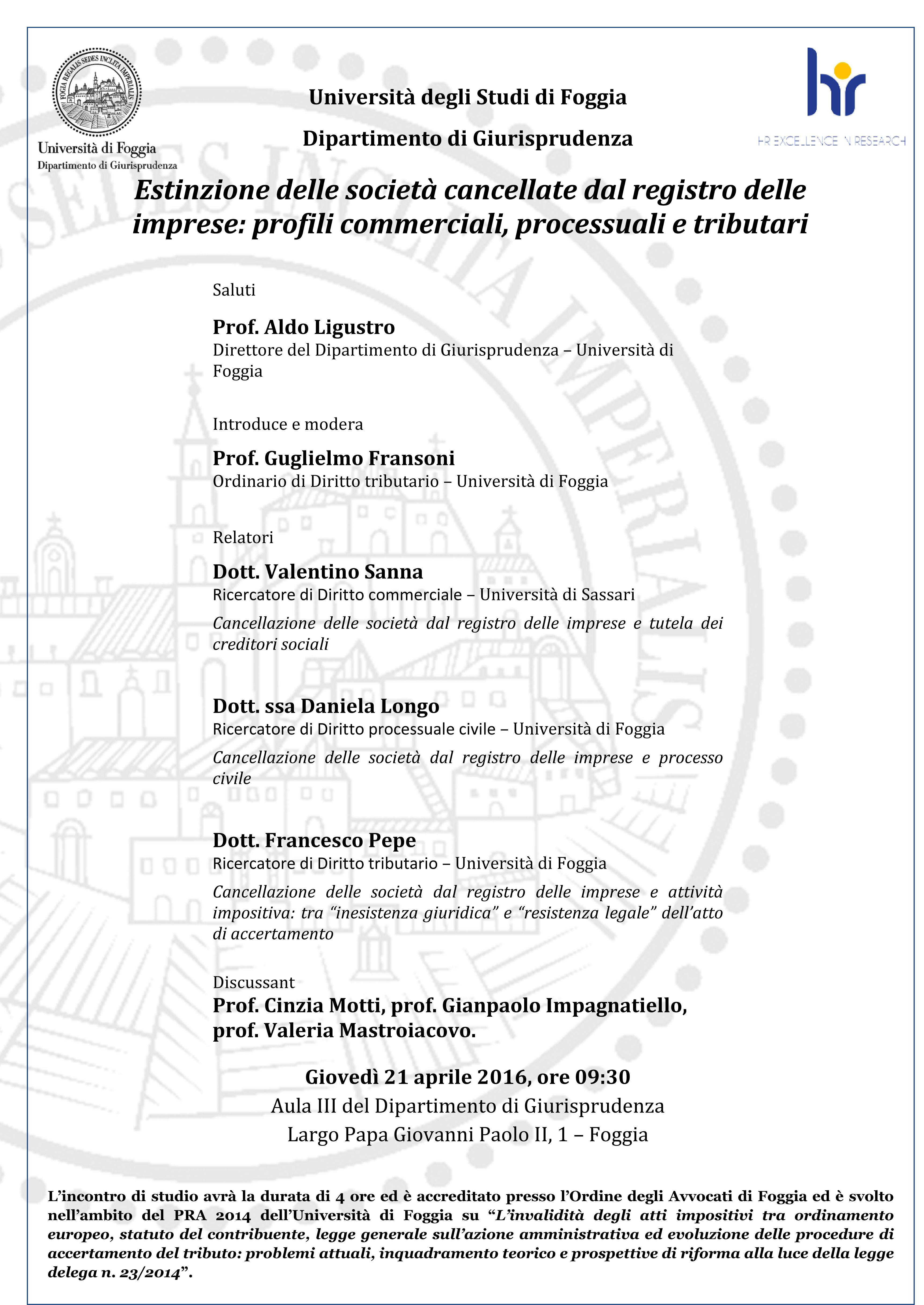 Estinzione delle società cancellate dal registro delle imprese: profili commerciali, processuali e tributari, Foggia 21 aprile 2016