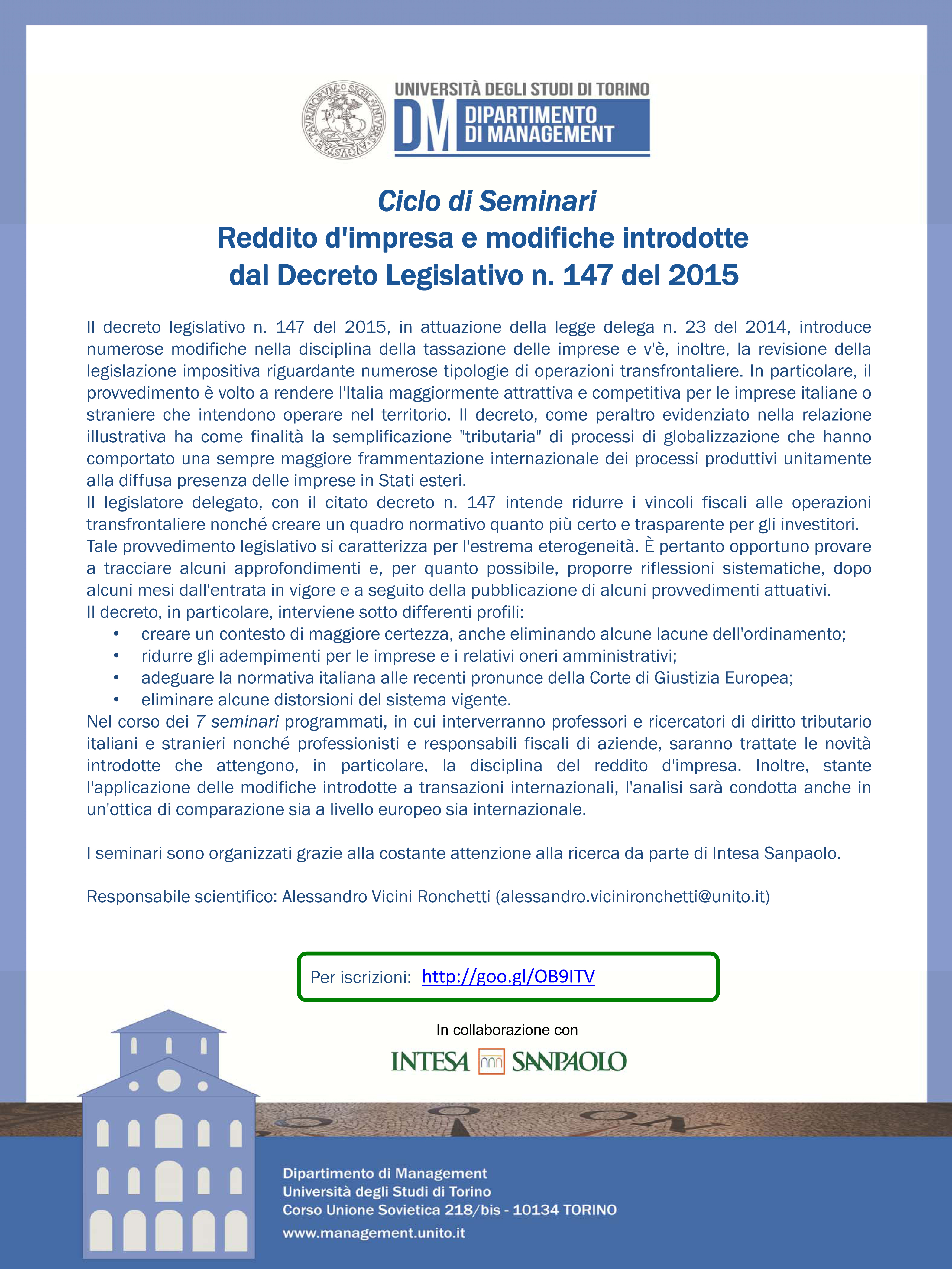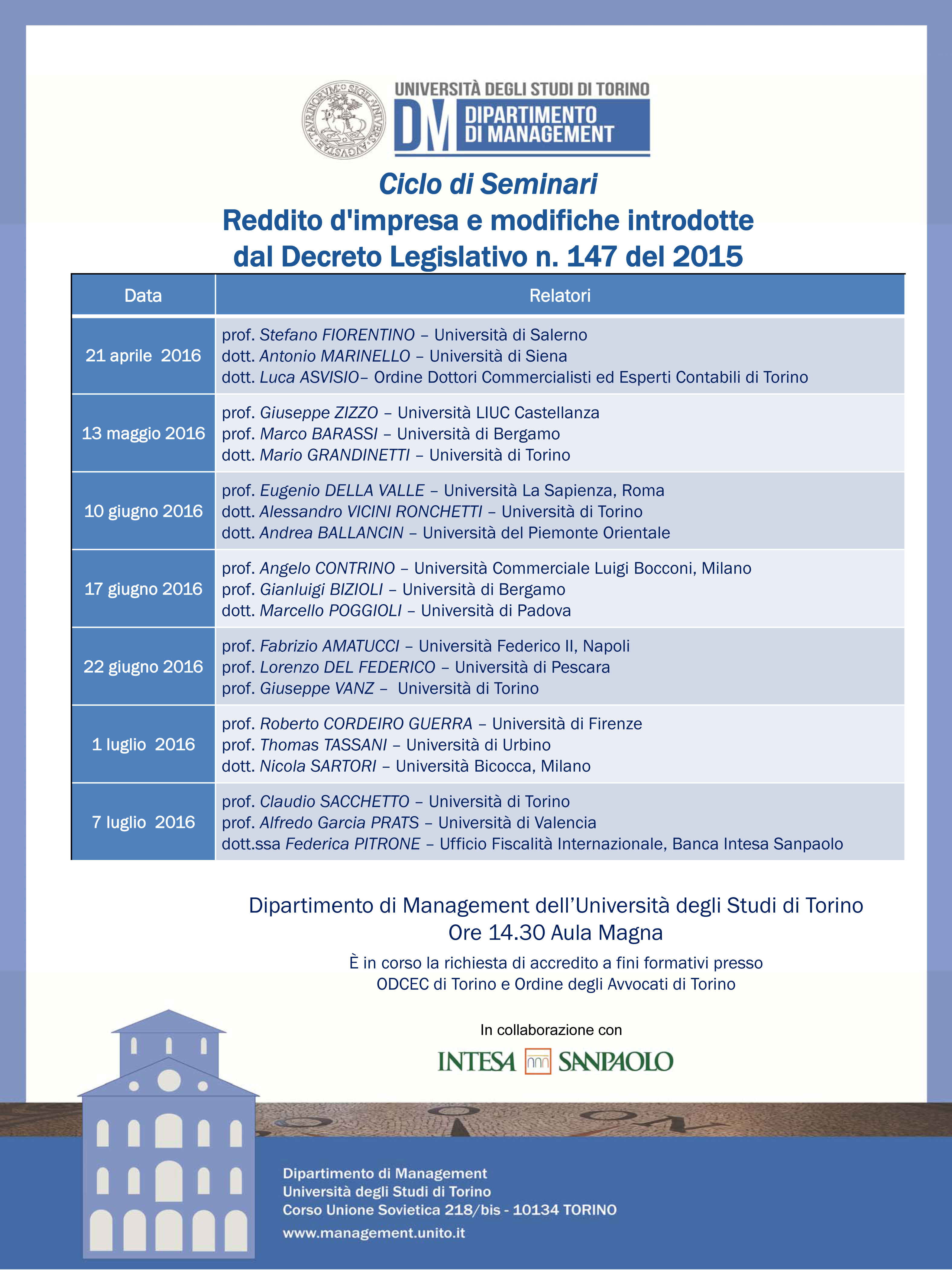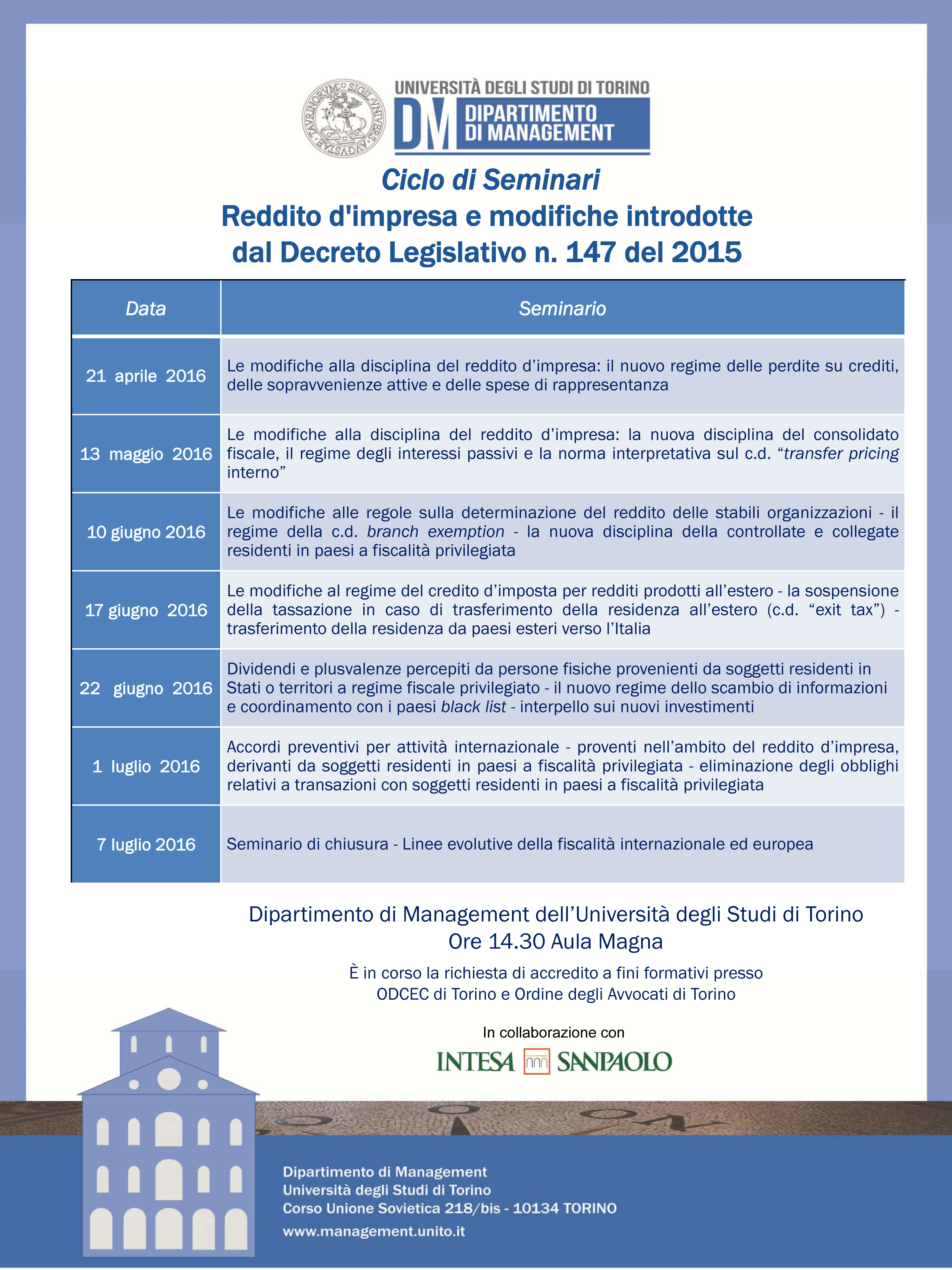 ciclo di seminari “Reddito d’impresa e modifiche introdotte dal decreto legislativo n. 147 del 2015”, Torino dal 21 aprile al 7 luglio 2016