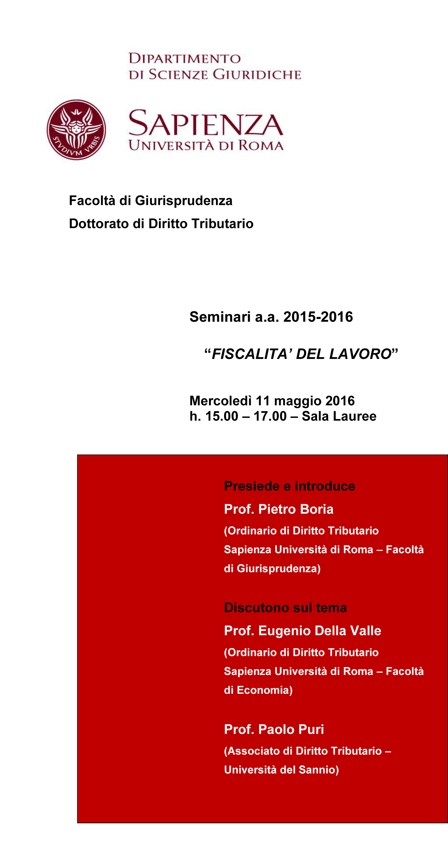 Seminari a.a. 2015-2016: “fiscalità del lavoro”, Roma 11 maggio 2016