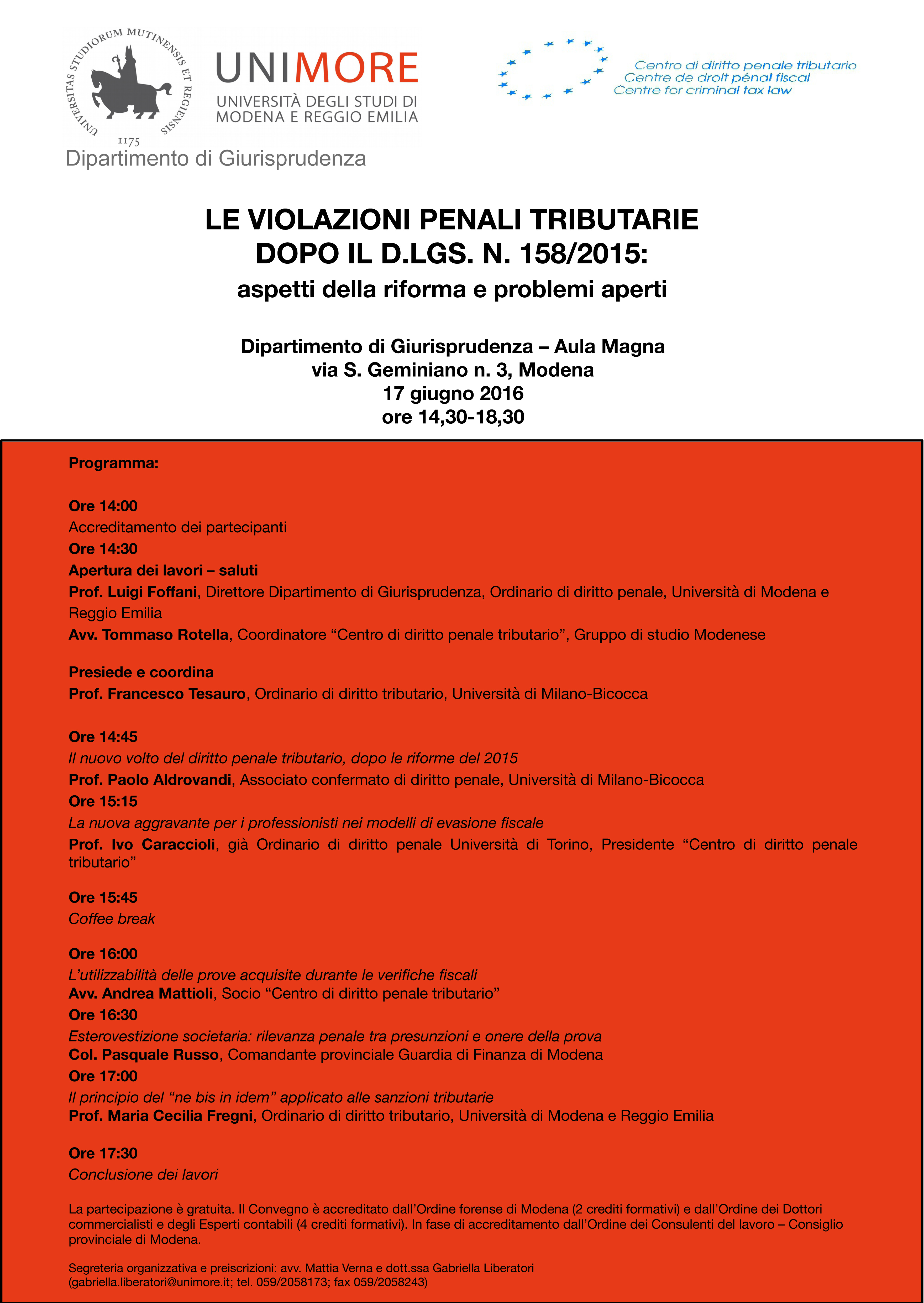 LE VIOLAZIONI PENALI TRIBUTARIE DOPO IL D.LGS. N. 158/2015, Modena 17 giugno 2016