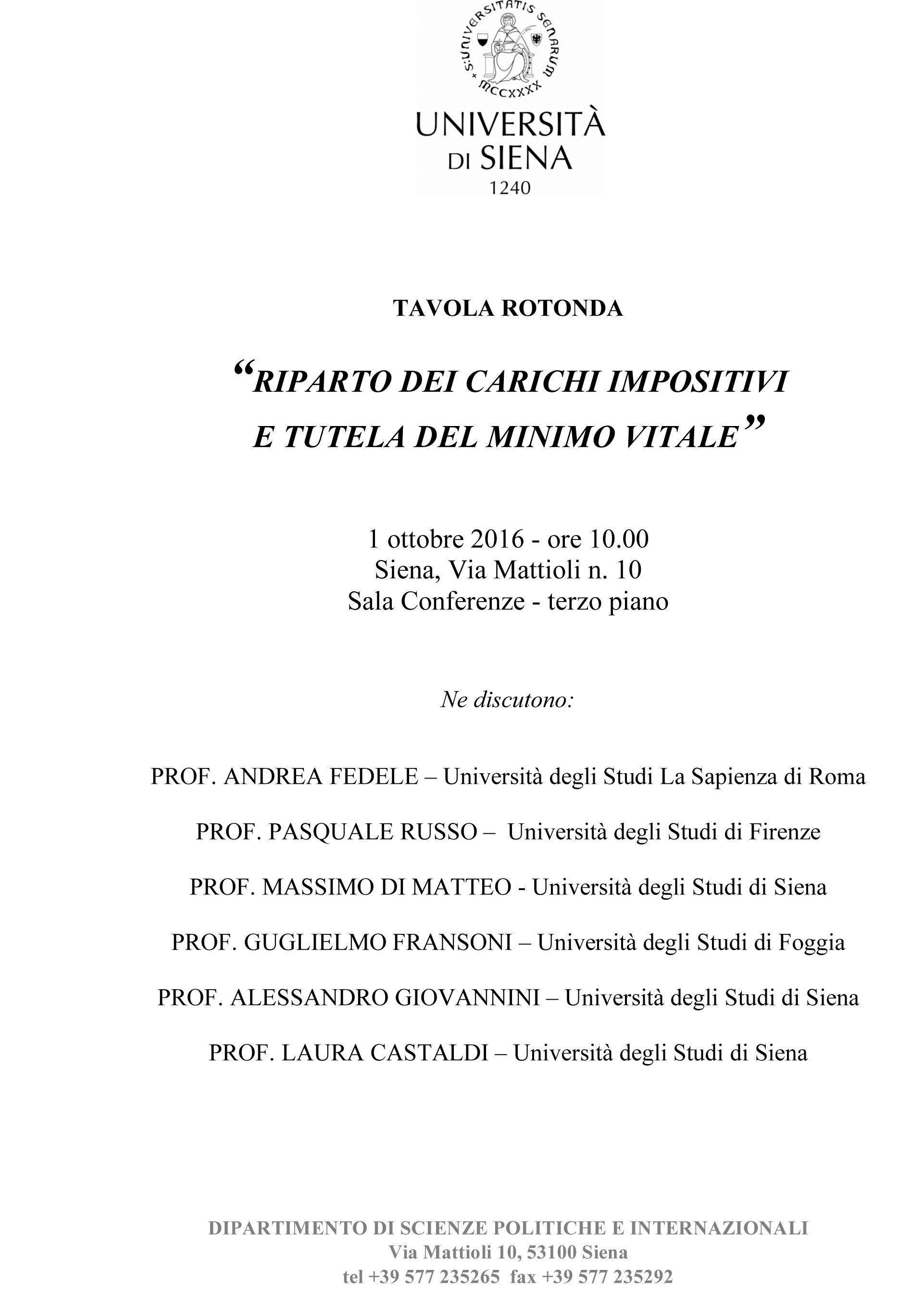 TAVOLA ROTONDA “RIPARTO DEI CARICHI IMPOSITIVI E TUTELA DEL MINIMO VITALE”, SIENA 1 OTTOBRE 2016
