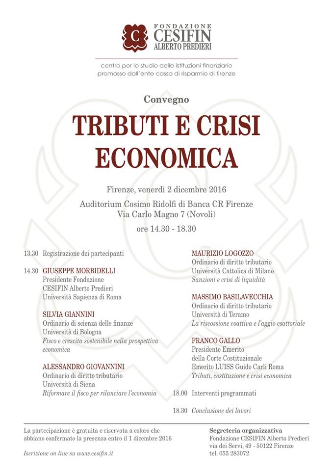 TRIBUTI E CRISI ECONOMICA, FIRENZE 2 DICEMBRE 2016