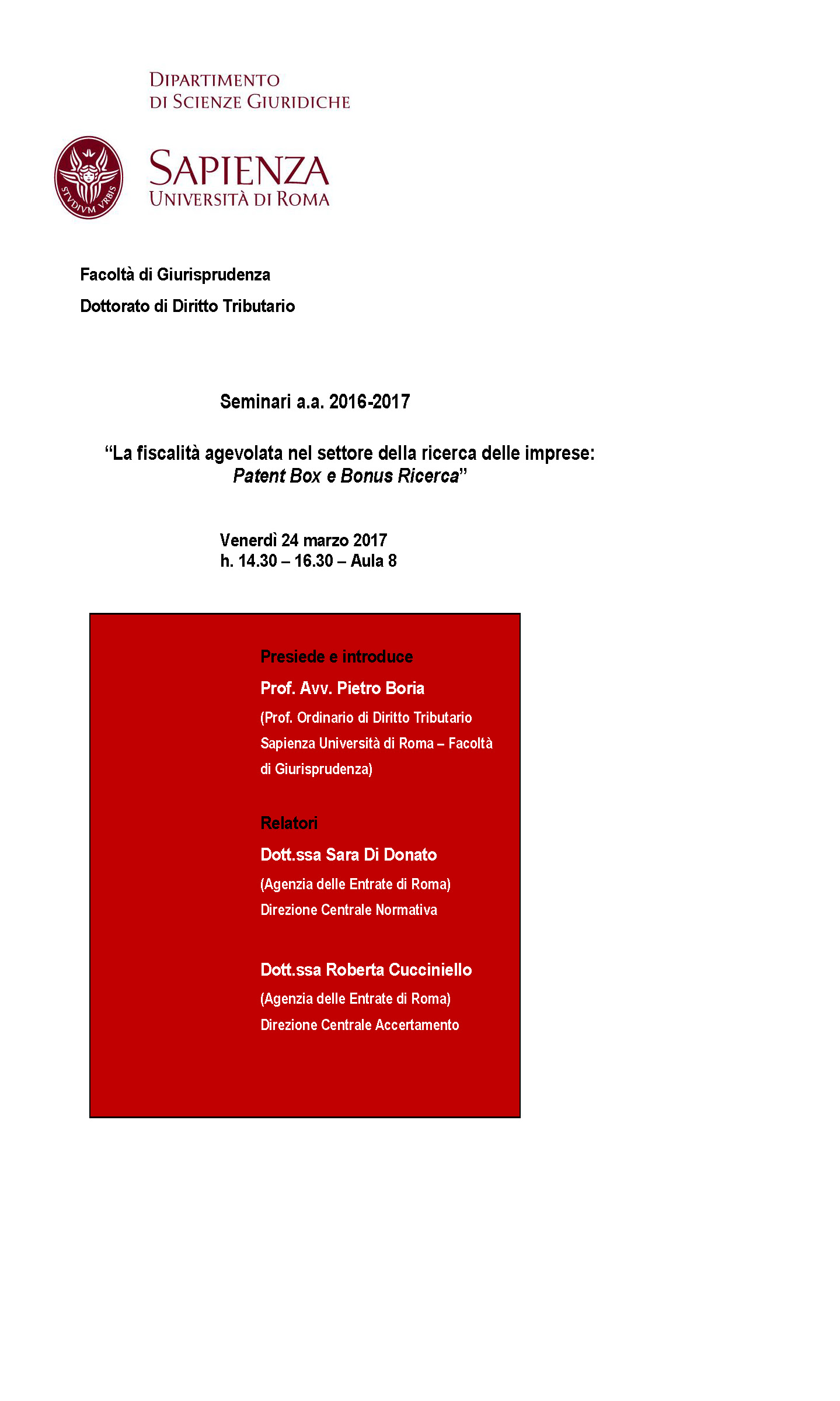 La fiscalità agevolata nel settore della ricerca delle imprese: Patent Box e Bonus Ricerca”. Roma, 24 marzo 2017